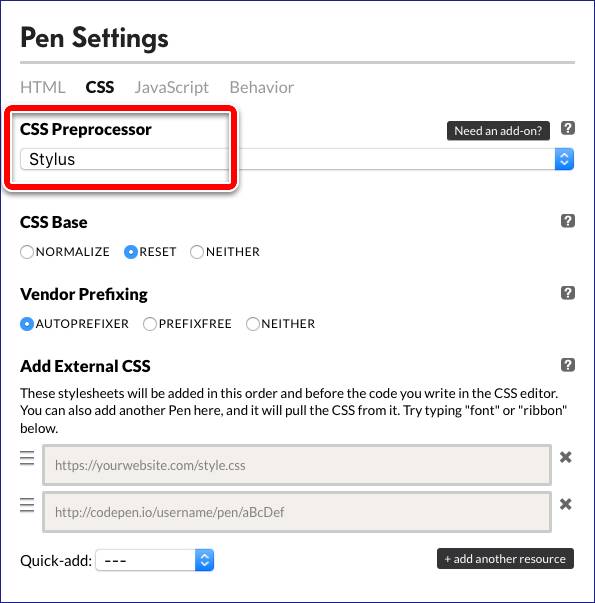 当然如果你懒得设置的话,可以直接套用魔法哥已经配置好的 Pen 模板。打开 http://codepen.io/pen?template=QKQvRw 这个链接就可以直接写 Stylus 代码了!